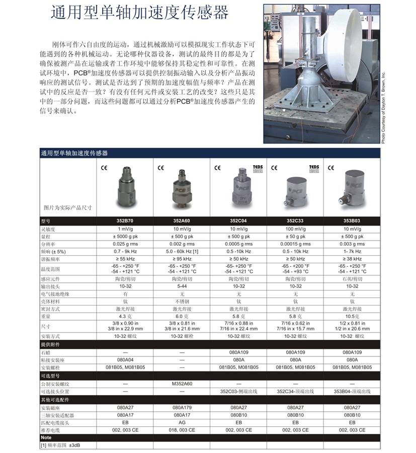 PCB Piezotronics制造精密型振動加速度計以滿足振動、沖擊、加速度測量和運動監測、控制和測試應用。PCB Piezotronincs提供ICP、PE、MEMS和電容傳感技術用于實現各種各樣的測量要求。PCB生產的加速度計有單軸、雙軸和三軸可選。這些產品用于工廠生產和設計人員以及研發組織的現場測試,從來獲取關鍵數據。除精密小型傳感器外,PCB的IMI部門還提供堅固的加速度計和振動傳感器用于工業機器振動監控。由于不同的測試和工業環境有不同的安裝條件,所以PCB制造的加速度計具有各種不同的靈敏度、溫度、頻率響應、振幅響應、外形和引線的接地配置以滿足不同的需求。加速度計來評估設備或結構性能的關鍵因素,因此,這樣的應用通常需要整個測量系統的校準證明,從傳感器到*終的輸出。美國PCB加速度傳感器353B03的每個傳感器出貨時都隨貨附帶一個可溯源到NIST的校準證書。