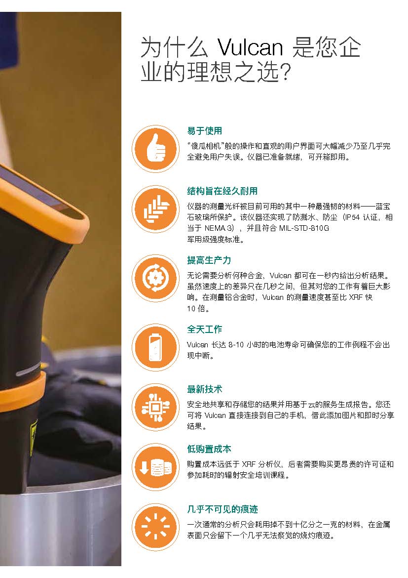 Vulcan 是一款耐用且分析速度極快的合金分析儀。扣扳機(jī)后一秒即會(huì)顯示結(jié)果。且產(chǎn)品使用激光誘導(dǎo)擊穿光譜技術(shù) (LIBS),您無需擔(dān)心X射線的影響。無論您的業(yè)務(wù)是廢料分選還是 PMI 質(zhì)量控制,Vulcan 始終提供準(zhǔn)確且一致的合金 牌號(hào)。