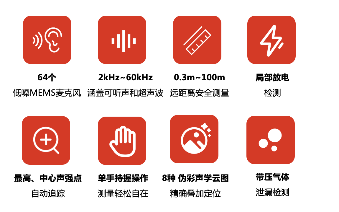 海康微影AP56系列聲波成像儀是一款專業的聲源定位產品。憑借64個低噪聲MEMS麥克風和從2 kHz到60 kHz的可調帶寬范圍,AP56提供了一種簡單有效的方法來定位工業環境中的加壓空氣泄漏或檢測高壓系統中的局部放電。采用4.3英寸大液晶觸摸屏,數字圖片上顯示的結果,讓您快速找到問題的根源。操作距離可達100 m,確保您在距離內進行檢查。采用這種輕巧易用的工具,您可以發現潛在的風險,減少故障排除,并節省設備故障和停機時間的額外成本。