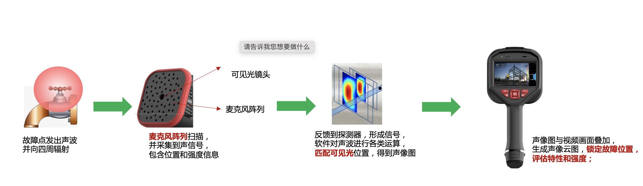 聲學成像原理 聲像儀——又名聲學相機,是利用聲傳感器陣列測量一定范圍內的聲場分布的專用設備。可用于測量物體發出的聲音的位置和聲音輻射的狀態,將采集的聲音以彩色等高線圖譜的方式可視化呈現在屏幕上,有效的測量聲場分布,聲場圖與可見光的視頻圖像**疊加,形成類似于衛星云圖的圖像,對故障位置,故障特性,強度進行顯示。 ![]()